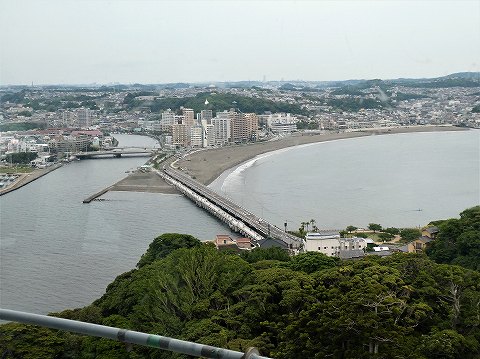 | 初めて江の島に木橋がかかったのは明治24年(1891)のことでした。それまでは潮が満ちてくると、片瀬浜から江の島へ渡るには舟か人足の背負いに頼るしかなかったそうです。車道の江の島大橋(橋長324m)は、昭和39年(1964)に開催された東京オリンピックに合わせて造られたものです。 |