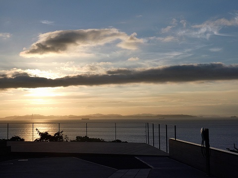 西側の窓から見えた海と夕日
