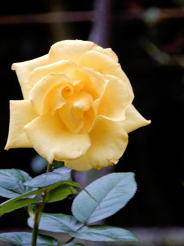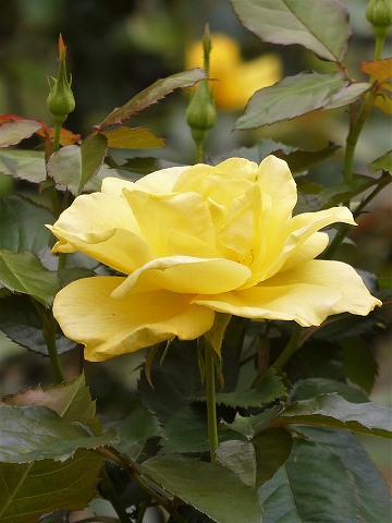 フロリバンダ系の園芸品種。花は鮮やかな黄色で