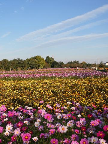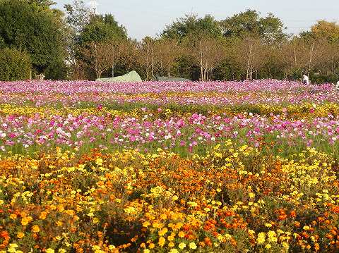 コスモス畑と、マリーゴールド畑が交互の帯となり並んでいます。 さあ、散策しましょう。