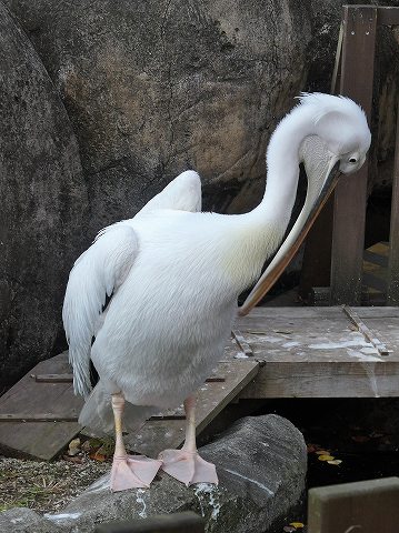 野生では群で水面を翼で叩きながら岸へ魚を追い込み、水面直下に上がった魚を輪になって囲み、大きなのど袋を使って一気にすくい捕るといった、追い込み漁をします。モモイロペリカンといっても通常退色は白色で、繁殖期に赤みを帯び、桃色に見えます。 |