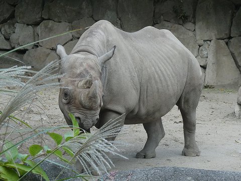 | クロサイの1亜種です。クロサイは1990年代に、5種のサイの中で、最も数が激減しました。現在生息数は徐々に回復していますが、1970年頃の1割にもおよびません。この亜種は、ケニアとタンザニアに500頭ほどが生息しています。深いヤブや半乾燥地帯に単独でなわばりをもって生活しています。木の葉を好み、とがった上唇を上手に使って食べます。視力は弱く、臭覚と聴覚はすぐれています。 |