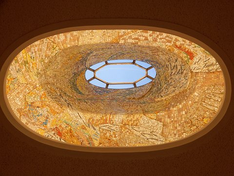 内側に当時新進気鋭のモザイク・フレスコ作家の作野丹平が制作したガラスモザイクによる≪四季≫が抽象的に表現されています。