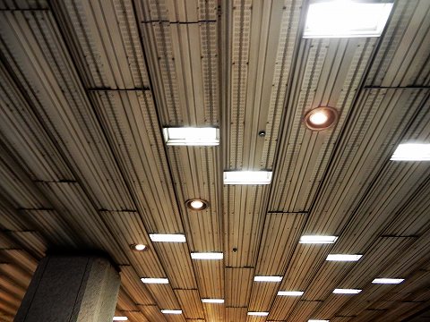 安価なアルミの押し出し材を張り巡らした天井。