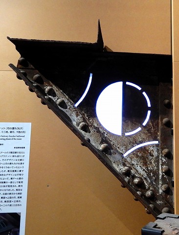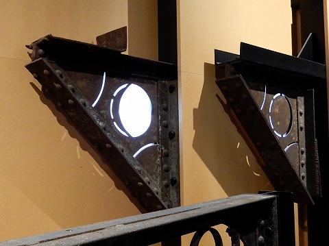 | 創建時、駅舎南北ドームの3階回廊の支えとして、鉄製三角形のブラケット(持ち送り)がつけられていました。そのデザインは文献によって、満月から新月へと月の満ち欠けを表すように、鉄板に真中をくりぬいていたということがわかっていましたが、戦災復興工事で撤去されたため、具体的なデザインは不明でした。保存・復元工事によって、南ドーム部の下屋根解体中に、鉄骨架構の一部として転用されていたブラケット10体が発見され、新月以外のデザインが明らかになりました。現在は復元されたブラケットが、北面の新月から時計回りに北東面=三日月、東面=上弦の月、南東面=十三夜、南面=望月、南西面=立待月、西面=下弦の月、北西面=二十六夜(三日月の反転)と配置されています。 |