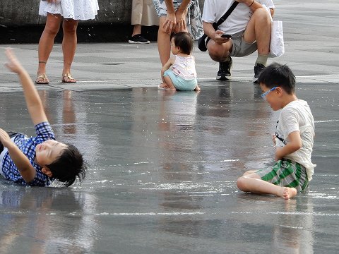 打ち水システムで水浴びする子供達
