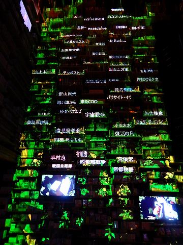 | 高さ8mの巨大本棚に囲まれた空間。KADOKAWAの刊行物と、角川源義文庫、山本健吉文庫、竹内理三文庫、外間守善文庫ほかの個人蔵書が一堂に並んでいます。また、本棚劇場では定期的に「本と遊び、交わる」をコンセプトとしたプロジェクションマッピングを上映します。 |