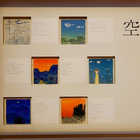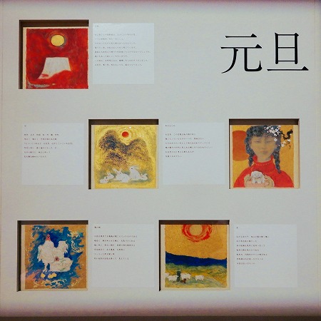 | 高山が13年かけて取り組んだ、文芸雑誌『文藝春秋』の表紙絵156枚、全点が展示されていました。1987年に、高山と同じく日展で活躍礎した先輩画家・杉山寧(すぎやまやすし)からそのバトンを受け継ぎました。一枚目の1月号に描かれた画家の言葉には、その偉業を引き継ぐことへの緊張が描かれています。杉山がそうであったように、表紙えの一枚一枚には過行く季節を慈しむような洗練された言葉が添えられています。その中の「元旦」と「空」でまとめられたグループです。 |