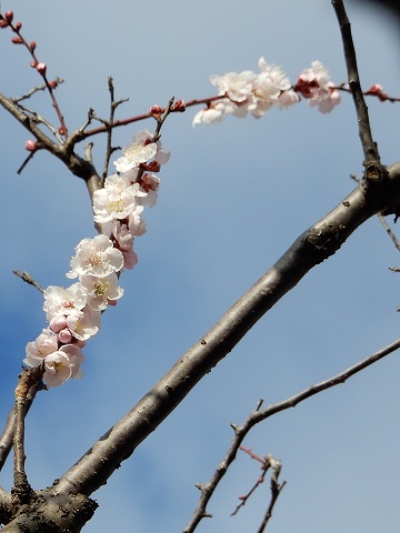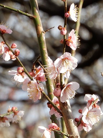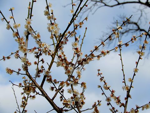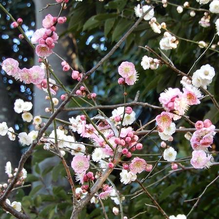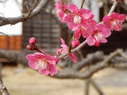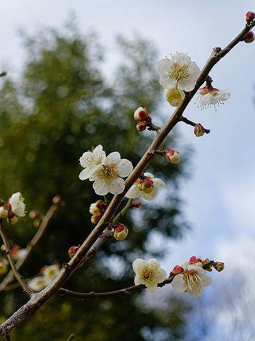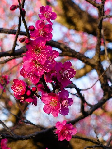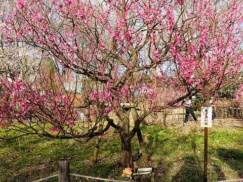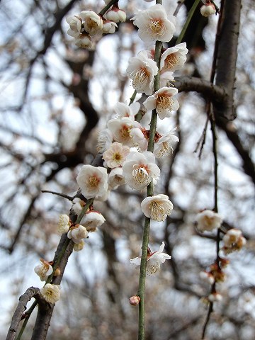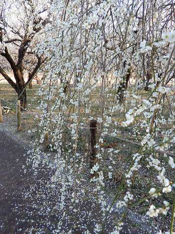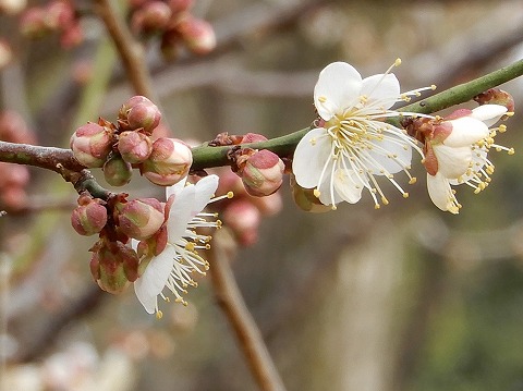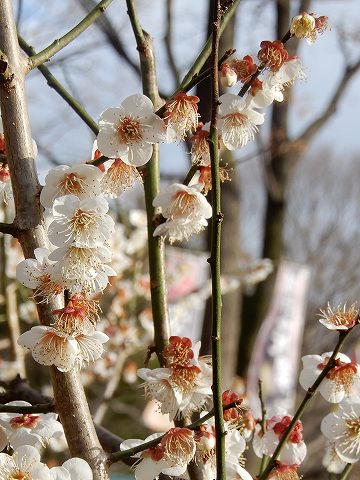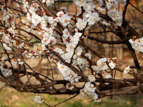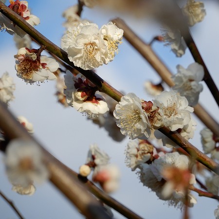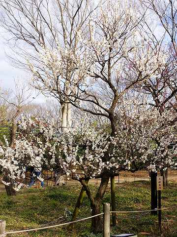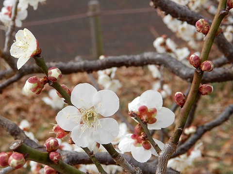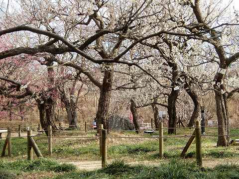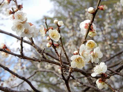 | ウメは、バラ科サクラ属の落葉高木で、果実を利用する品種を『実梅《みうめ》、観賞用の品種を『花梅《はなうめ》』と言い、大きく2つに分類されます。「実梅」の代表格は『南高《なんこう》』です。果肉が厚くて柔らかく、種が小さいため、梅干に最適だといわれています。郷土の森では、関東地方中心に栽培されている「白加賀」や、大分県原産でアンズとの交雑種である「豊後」を主に植えています。『花梅』は「冬至」という白い花を咲かせるものや、紅梅の八重寒紅《やえかんこう》などが有名で、どちらも観賞頂けます。 |
