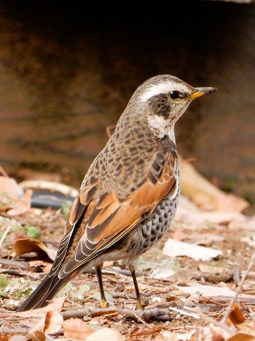 河原や公園など、日本全国で見られる野鳥。頭頂から、背中にかけて褐色で、腹は白と黒のまだら模様。くちばしは根元が黄色く先が黒い。ヒヨドリほどの大きさで、冬から春にかけての暖かい日に地面を歩いたり停まったりする。体をくの字に曲げて地面を掘っている姿もよく目にする。一定の距離に近づくと警戒して鳴きながら飛び上がる。枝にとまっていることもある。