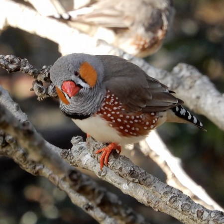 オスは首から胸にかけて縞模様があり、ほほにはオレンジ色の丸い模様があります。