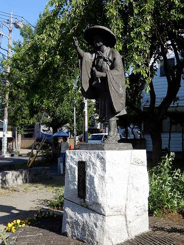 河合曾良像と、この先の札場河岸公園内の松尾芭蕉翁像とは100m程離れ、建立された年も異なりすが、二つの像は対をなす作品です。