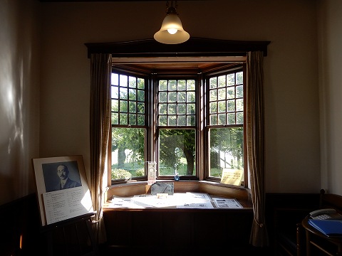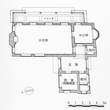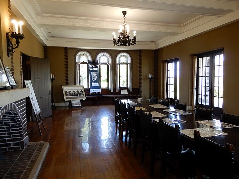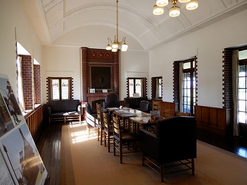 誠之堂と同様、広間一室を正面に配し、背面に玄関、予備室などを配し、前面にベランダを張り出す。広間は、誠之堂よりさらに簡素で地味である。中央に暖炉を配し、焚き朽ち廻りと両側の柱型にスクラッチタイルを貼る。天井は梁型を顕わとし、梁型の両側と周囲の天井蛇腹に草花文の彫刻を施す。幅木は淡色の石貼。南北両端の三連アーチ窓の下部に木製ベンチを設け、アーチ窓の窓枠やステンドグラスもパステル調の淡い色調とし、軽快でくつろいだサロン的雰囲気を創り出している。 |