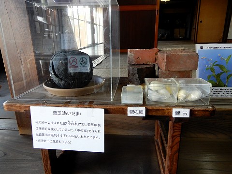 | 藍玉とは 藍の葉を発酵・熟成させた染料である蒅(すくも)を搗(つ)き固めて固形化したものです。藍の生産地としては徳島県の阿波が最も盛んでしたが、ここ深谷市北部の利根川沿いの地域でも藍の栽培が盛んでした。利根川沿いの地域は、藍の生育に適しており、良い藍を育てる肥料として必要な〆粕や干鰯(ほしか)を、中瀬河岸場で手に入れることができました。当地でつくられた藍玉は「武州紺」と呼ばれ、衣類を鮮やかな紺色に染め上げる染料として人気がありました。 |