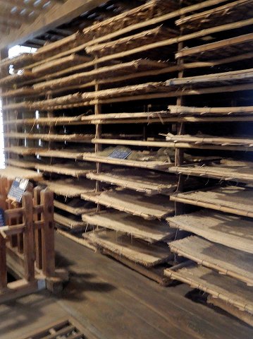 | 蚕自身の重みを利用して回転する蔟(まぶし)。この蔟は四角形の段ボール紙製で碁盤の目状に12X13の枠を設けます。蚕は繭を作る時高いところに登る性質があり、回転蔟はこの蚕の性質を利用し、上に登り重くなると回転します、下になった蚕は上を目指して移動し、数回転の後に蚕はそれぞれ空いたスペースに入る仕組みです。上蔟後は木枠から外して繭を取り出しました。使用後は折りたためます。回転蔟は使用時には数段に配置でき、未使用時は蔟・木枠とも折りたためて効率が良く全国に普及しました。 |