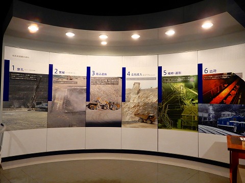 立坑に投入された石灰石は、プラント設備にて、破砕・ふるい分け・選別・運搬を繰り返し、用途に応じた様々なサイズの石灰石製品が生産される。 |