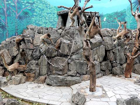 とてもすばしっこいサルで10数頭から数百頭の群れで生活し、昼間は、エサなどを求めて休みなくジャングルの中を移動しています。群れの仲間同士は、鳴き声でコミュニケーションをとっています。 |