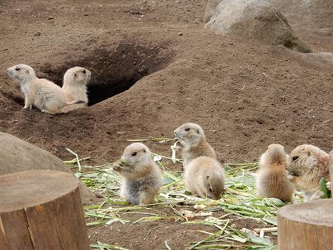巣穴の周辺に土を盛り上げたマウントと呼ばれる見張り台を作り、コヨーテやタカなどの天敵が近づくと「キャンキャン」という仔犬のような泣き声で仲間に警告することから、プレリードッグ(草原の犬)という名前がつきました。一頭のオスに数頭のメスと子どもたちで構成される一夫多妻で、2~3月にかけ4~6頭の仔を出産します。 |