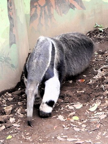 体長は130~150㎝程の大型で、体は灰褐色、のどから肩を通り、背に達する黒帯があり、その周囲は白で縁取られます。長い尾は30㎝ほどの毛で覆われており、吻(くちさき)は細長く、円筒状になっています。口の中には歯は1本もありません。ミミズのようになっている舌は1分間で約150回出し入れすることができ、最大で60㎝も出すことができます。 |