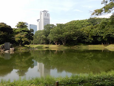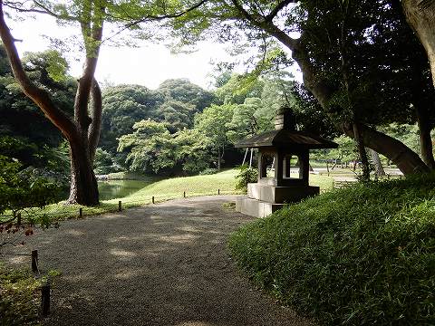 | この庭園の中心となる景観、蓬莱島と竹生島を拝し、琵琶湖を見立てて作られた。昔はこの池で舟遊びをしたといわれている。 |