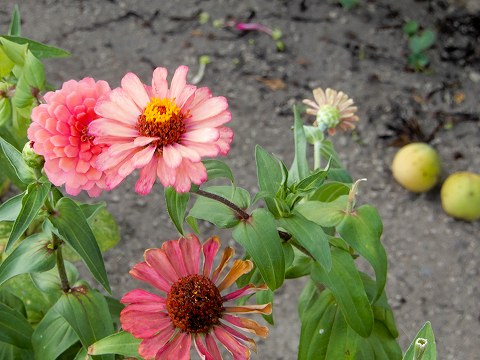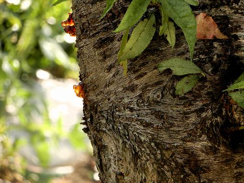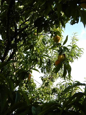 誰も拾わない、たくさんの花桃の実が足元に落ちています。