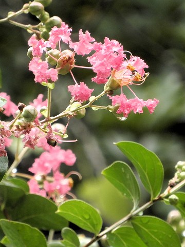 少し前まで降っていた、雨のしずくと、サルスベリの花