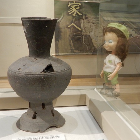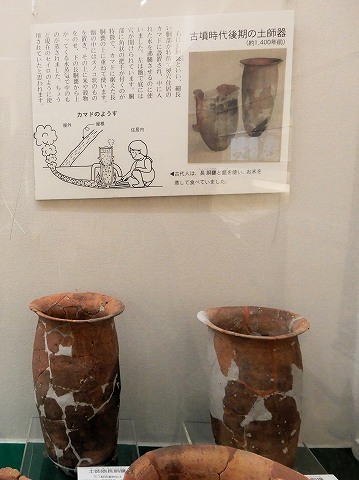 展示パネルの写真右は長胴甕(ちょうどうがめ)といい、細長い胴部が特徴で、竪穴住居のカマドに設置され、中に入れた水を沸騰させるのに使いました。