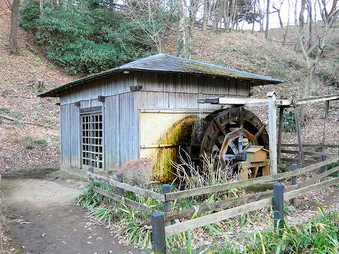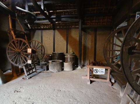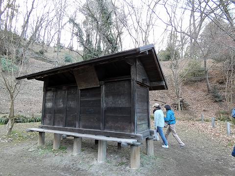 | この建物は、板倉といい農家の屋敷内で、日当たりの良い場所に建てられ米や雑穀を、籾のまま保存する為使われました。 この板倉は町田市相原町の、渋谷十三氏宅にあったもので、江戸時代末期に建てられたものと思われます。昭和58年12月に解体し、60年1月に復元しました。構造は5つの室からなっており、各室とも三方の壁、床、天井を板で囲い前面は揚げ板となっていて、この揚げ板を引き上げて穀物を出し入れするようになっています。地方によっては、揚げ板の下部に穀物の取り出し口を設けたものもあります。掘っ建て柱の上部についている板は「ねずみ返し」と言い、ねずみの進入を防ぐために、つけられています。 |