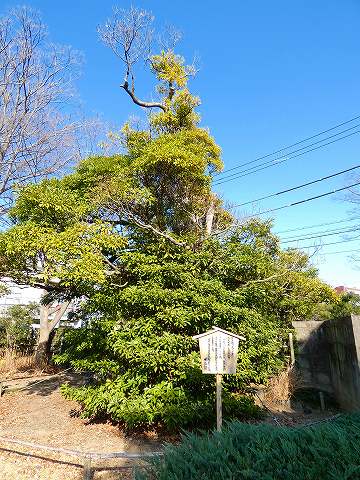 正面のタブノキは、樹齢750年以上といわれ、通称「抹香屋のタブ」と呼ばれています。かつて抹香つくりを生業としていた旧田沢家が、抹香の原料としてタブノキの葉や皮を使っていたといわれています。