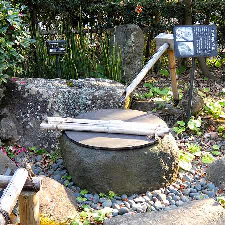 このつくばいの石鉢は、かつて抹香屋で抹香を擂(す)る際に使われていたものです。前庭には、石臼が埋められており、抹香を挽(ひ)いていたものと考えられます。