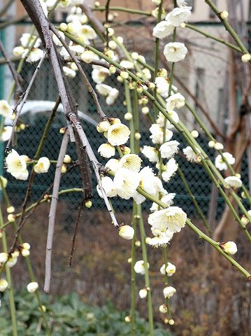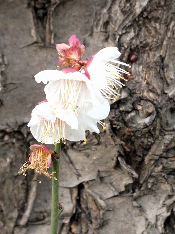 | 緑萼枝垂れ梅、花は中輪白花で美しい花梅です。野梅系青軸性(あおじくしょう)といわれ、野梅(のうめ)から変化した原種に近い花梅といわれています。 |