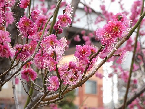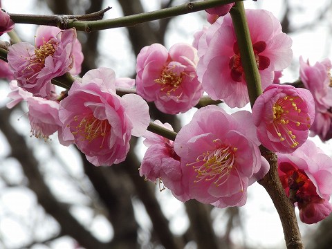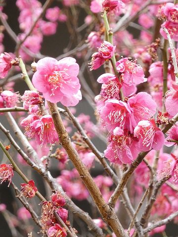 | 緋梅系・紅梅性の遅咲き品種です。花は明るい緋赤色で中輪の一重咲きです。花つきがよく丈夫で庭木に向きます。 |