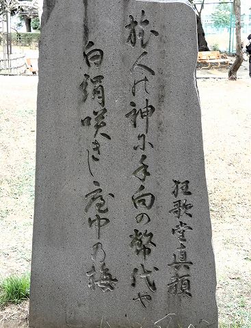 昔、梅屋敷の園内には数多くの碑石がありましたが、所有者が移った時や戦後の混乱期に姿を消してしまいました。この歌碑はそれらの一つを資料をもとに復元したものです。