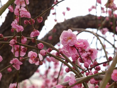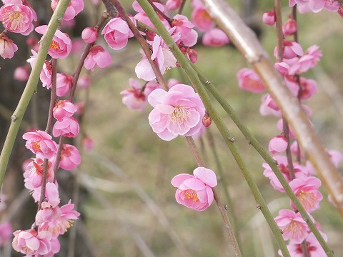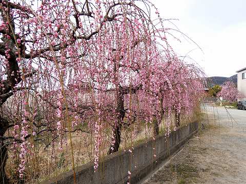 駐車場近くの 枝垂れ紅梅