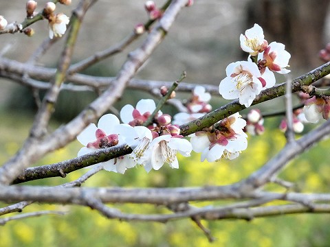 梅の背後におぼろに菜の花が映っています。