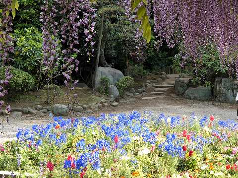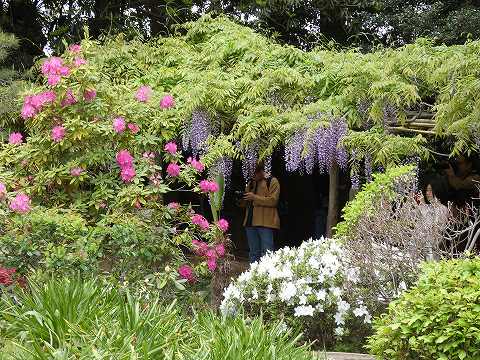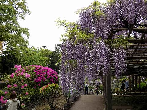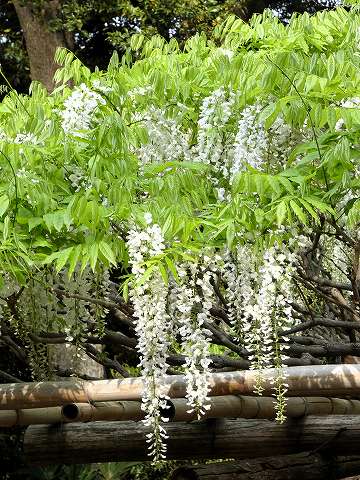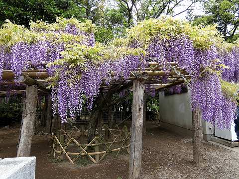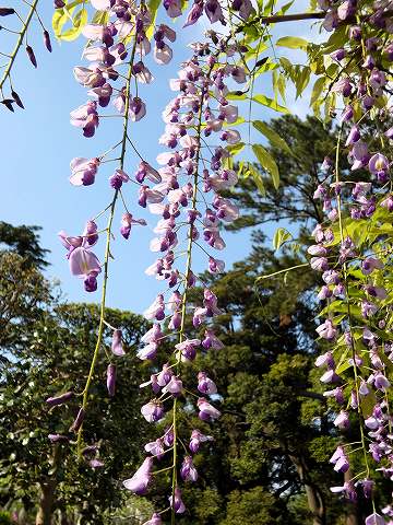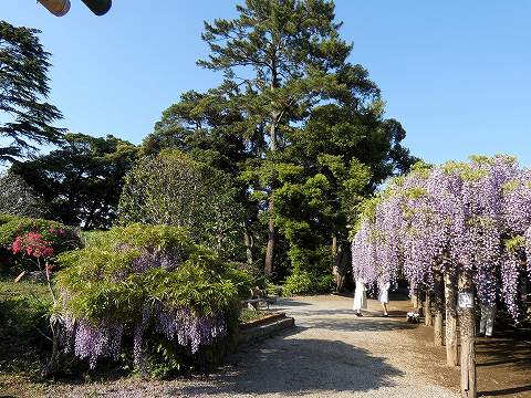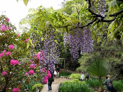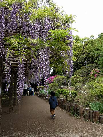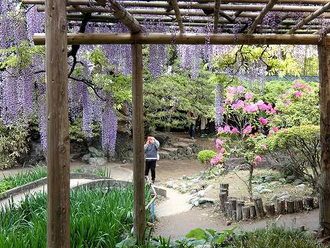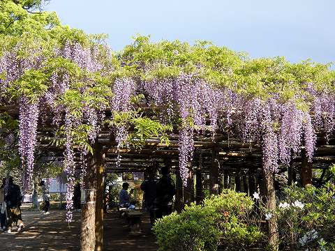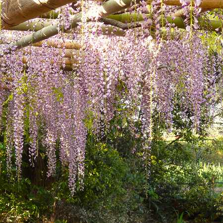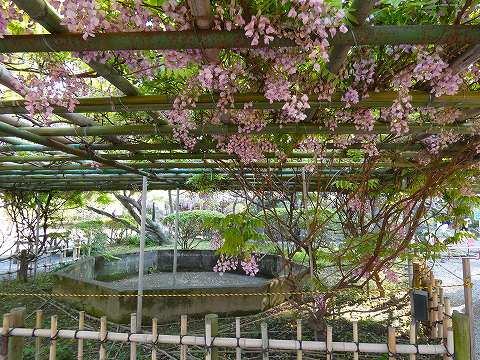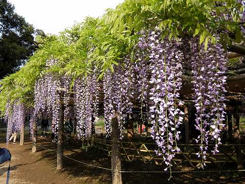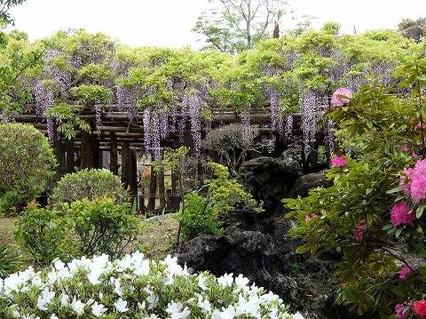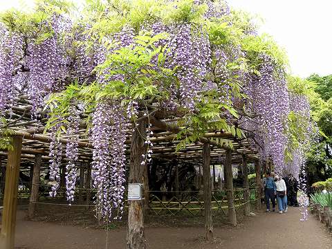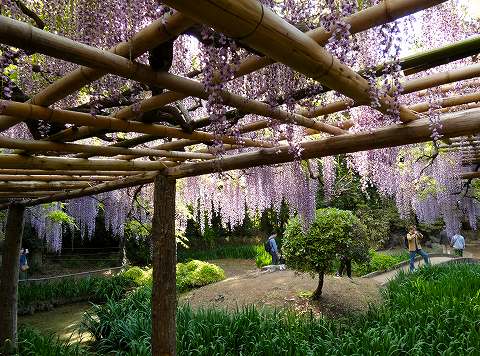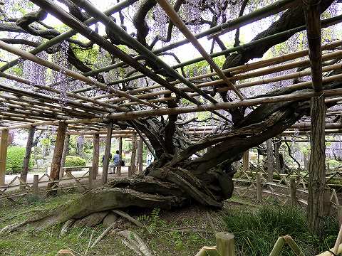 当園には面積約 700㎡の藤棚が3カ所にあり、各々の古木の大樹は、根元から数本に分岐して四方へ枝を広げています。花の、見頃は毎年、4月下旬~5月上旬の花時の眺めは世界一と称賛されます。 |