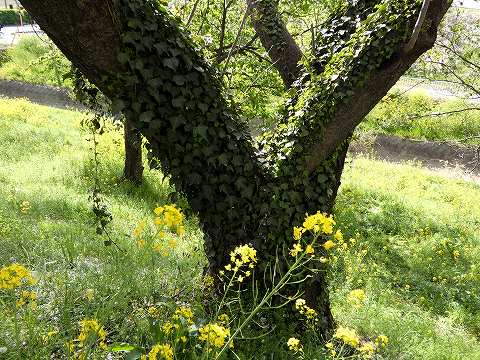 桜の下に咲いている菜の花