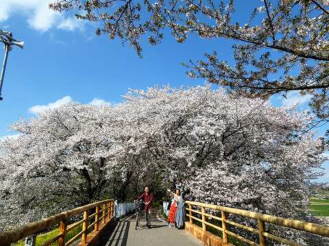 | 埼玉県比企郡吉見町にある公園です。土手沿いの「ふるさと歩道」には500本ものソメイヨシノが植えられ、約1.8kmにわたる桜並木は埼玉の桜の名所のひとつに数えられます。 |