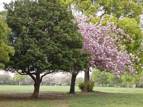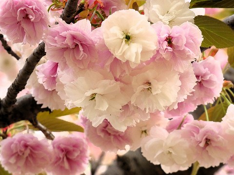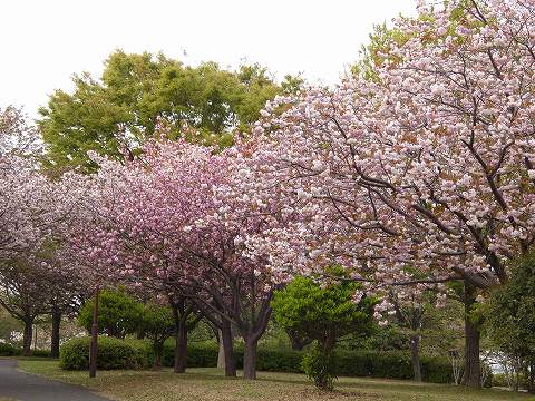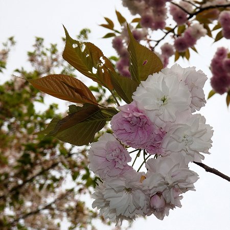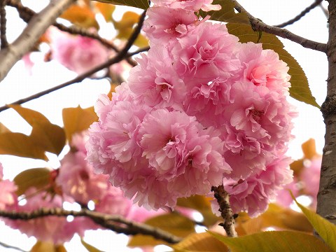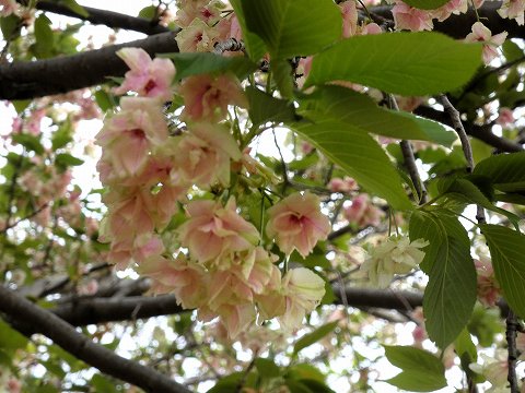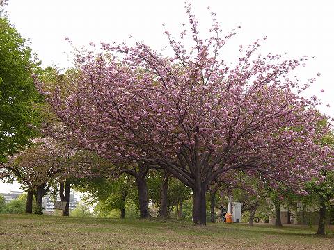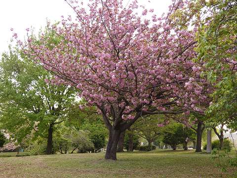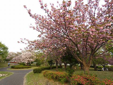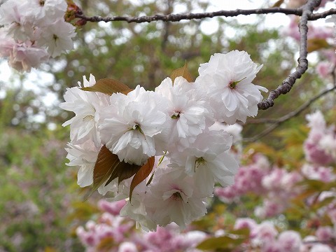いつもと違う公園内の道で行くと、八重桜の数の多さに気がつきました。
