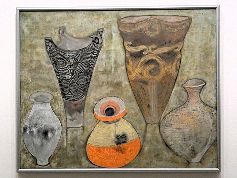 1945年に第二次世界大戦が終わると、考古学ブームが起こりました。たくさんのアマチュア考古学者が発掘を行い、成果をあげました。日本という国がいつ、どうやって始まったのか、記紀神話に基づく戦前の歴史観を乗り越えて真実を知りたいという熱気が、社会を覆ったのです。1960年代になると、「縄文」「弥生」という日本独自の時代区分が定着しました。作家は当時、東京国立博物館に展示されていた土器や埴輪を目にして、二点の<古代より>を描きました。