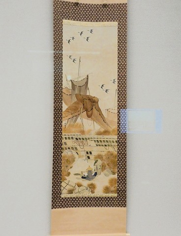 かつては日本各地の浜辺の冬の風物詩だった、海苔の天日干し。この絵の取材地はわかっていませんが、横浜の画家 雞村にとっては身近な題材だったことでしょう。横浜の根岸湾は当時遠浅の豊かな漁場で、海苔の養殖が盛んだったためです。その光景は、鶏村を厚く支援した実業家・原三渓が横浜に造った庭園「三渓園」からもよく見渡せました。鶏村はこの絵で、漁具のかたちの面白さを際立たせました。海苔が整然と並ぶ干し場。束ねた「海苔ひび」(海中で海苔を付着させる木の枝)のこんもりとした形。その後ろには、櫂を使って広げた袋網が高々と干されています。のびやかな構図がおおらかさを感じさせる一方、細部はとても綿密に描かれています。