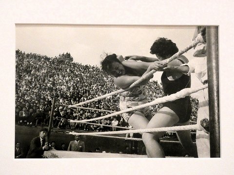 リングの上でもみ合う二人の女性。その背景で、隙間なくいっぱいに並んだ観客がリングを見つめています。会場は、野毛山公園に隣接する場所にかつてあった野毛山プールです。女子プロレスは当時、おもに芝居小屋やキャバレーで開催され、見世物のひとつとして捉えられることがありました。常盤は、興業だけでなく女子プロレスラーの養成所にも足を運び、彼女たちが明るく練習に励む様子を目にします。写真には、スポーツマンとして試合に熱中する女性の姿と、彼女たちに視線を向ける人々が、対照的に写し出されています。