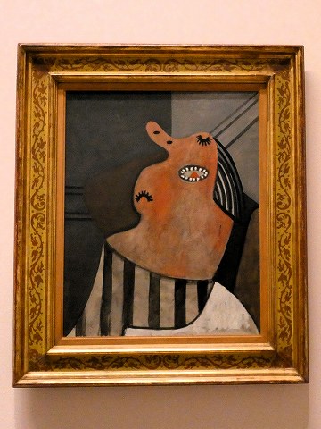 しかしピカソは、最終的に胸から上だけを切り取って作品を仕上げました。このため完成作では、開いた襟元は裸の上半身に、縦縞のドレスの胸の部分は下半身を包む腰巻きのように変化しました。つまり、着衣がセミヌードに化けたのです。また、前年のモデルは目を開いていましたが、ワルテルは大きく口を開け、無防備に眠る姿で描かれています。同時期に描かれた≪肘掛椅子に座る女≫(1927)にも、びっしりと並ぶ歯のある丸い口が見られます。