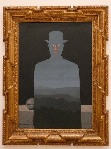 山高帽子の男はマグリットが好んで絵の中に登場させた人物です。この作品は体の輪郭線と目、鼻、唇といった顔のパーツを除いて、森と山の風景に満たされてます。さらにマグリットはこの作品のタイトルを友人に決めさせたそうです。そのほかいくつかの点でも謎めいて見えるでしょう。しかし、同時にこの作品はこうすれば謎めいて見える、という方法の実験であるともいえます。例えば、絵の中の前後関係を反転させる、タイトルを他人に委ねるなど、謎を作るための秘密が、この作品に仕組まれているのです。謎であり、種明かしでもある。この二重性がマグリットの妙味といえるでしょう。