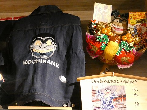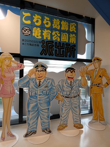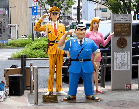 亀有駅前で出迎えてくれる、両さんら三人の銅像