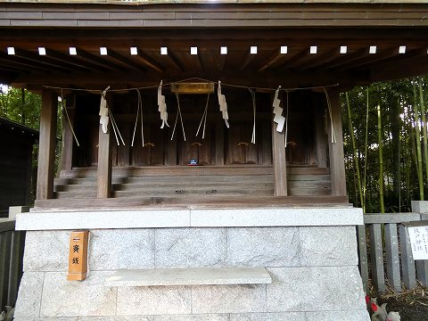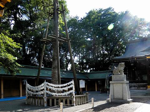 | 拝殿に向かい左の、おみくじ納めに囲まれた「道灌槇」と呼ばれ、太田道灌が500年以上も前に植えたという槇の木です。もっと上に伸びています。知らずにちゃんと撮らず後悔しました。 |