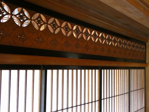 | 大広間の付書院には、桐材を用いた欄間が付きます。花菱七宝繋ぎを三段重ね、間隔を開けて遠山家の家紋である「丸に二引両紋」が配されています。 |