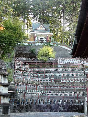五重塔のある丘の上に続く階段の、二体の龍を模した手すり