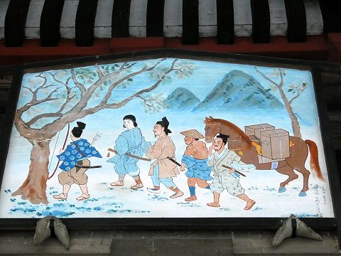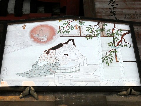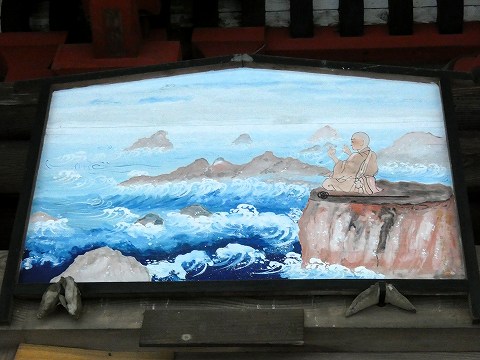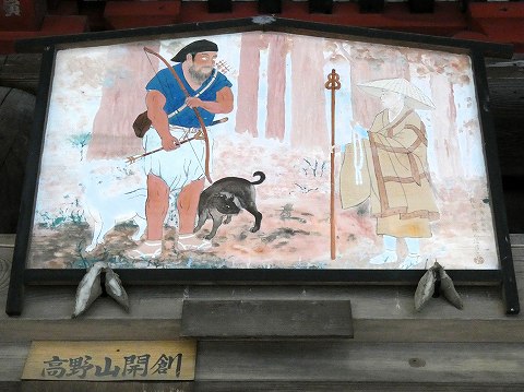 お大師様は、白黒二匹の犬に案内されて高野山に登る途中、丹生明神(にゅうみょうじん)のお社の所まで来ました。すると明神様が姿を表し、お大師様をお迎えし、「今菩薩が此の山に来られたのは私の幸です。南は南海、北は紀ノ川、西は応神山の谷、東は大和国(奈良県)を境とする此の土地をあなたに永久に献上します」と告げられました。、