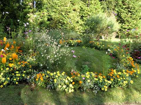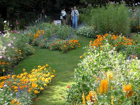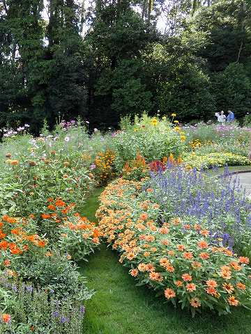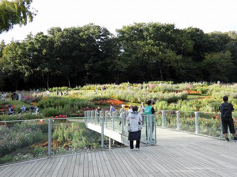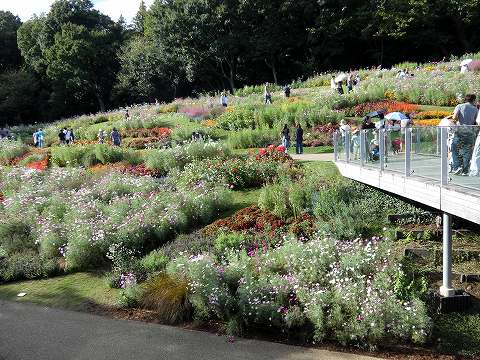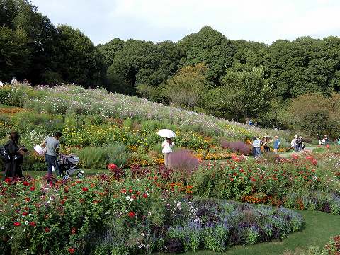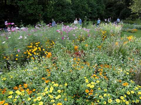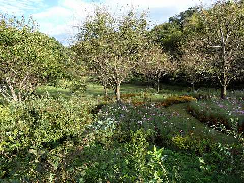 | 大花壇裏側の谷地。草花・木々の奥に芝生が広がります。 |
